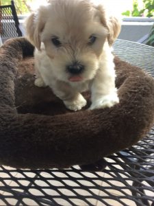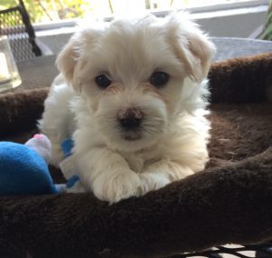 This is Ginger. As sweet as they come, she tips the scales at 1.45 pounds so she’s going to be a little girl. Ginger was Puppy #5 and she is solid white.