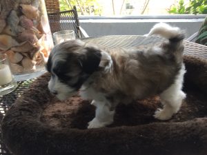 This is Squash, Puppy #6. Squash is the puppy I had to bottle feed for 4 weeks but as soon as the pups got on solids last week he took off! He’ll be small but not as small as a couple others. He is sable parti with four white stockings and a pretty white blaze. Squash weighs 1.7 pounds.