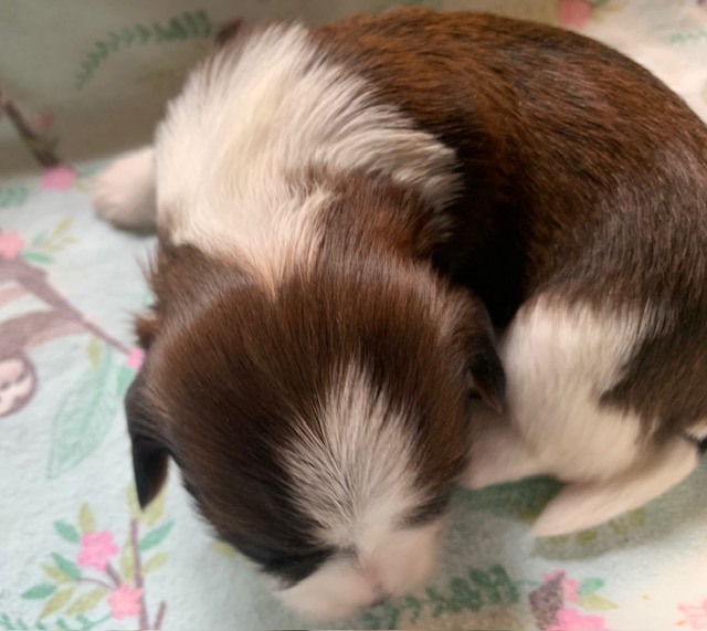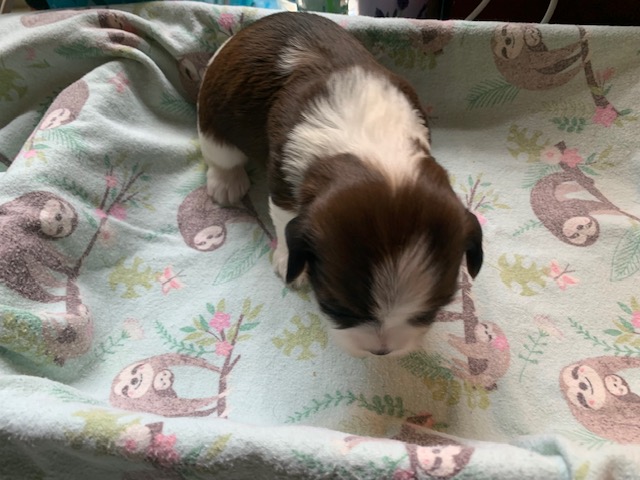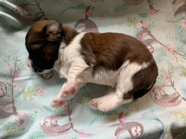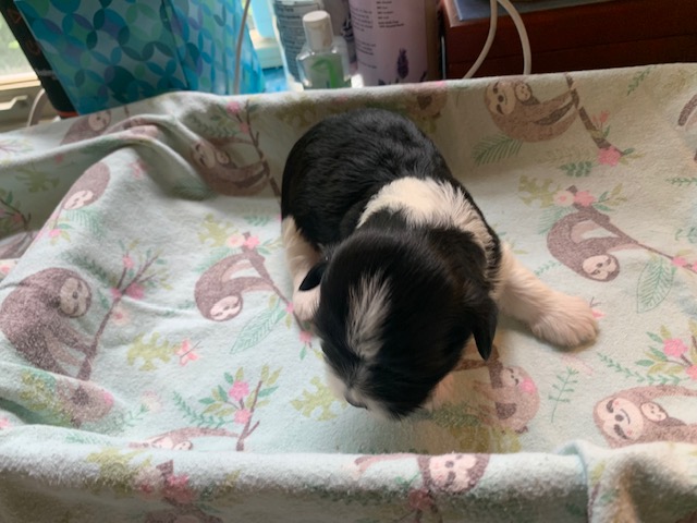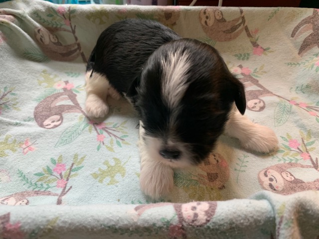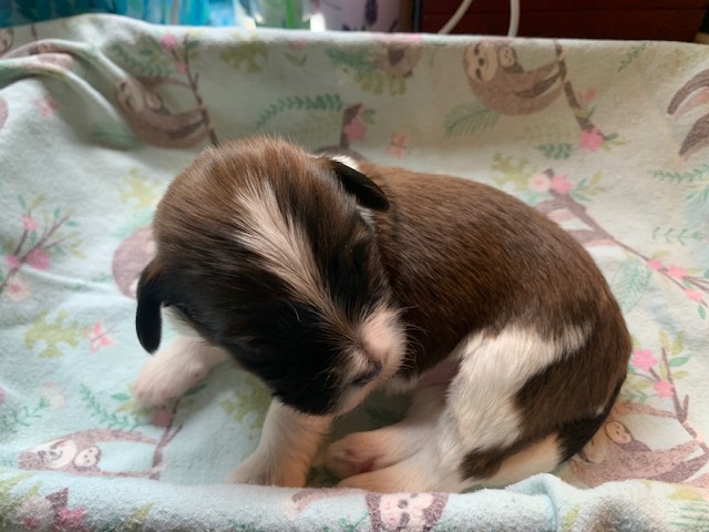 Sunshine had 5 puppies, 3 boys and 2 girls. The beautiful cream pup is a boy. The 2 girls are sable parti and the other 2 boys are black parti.