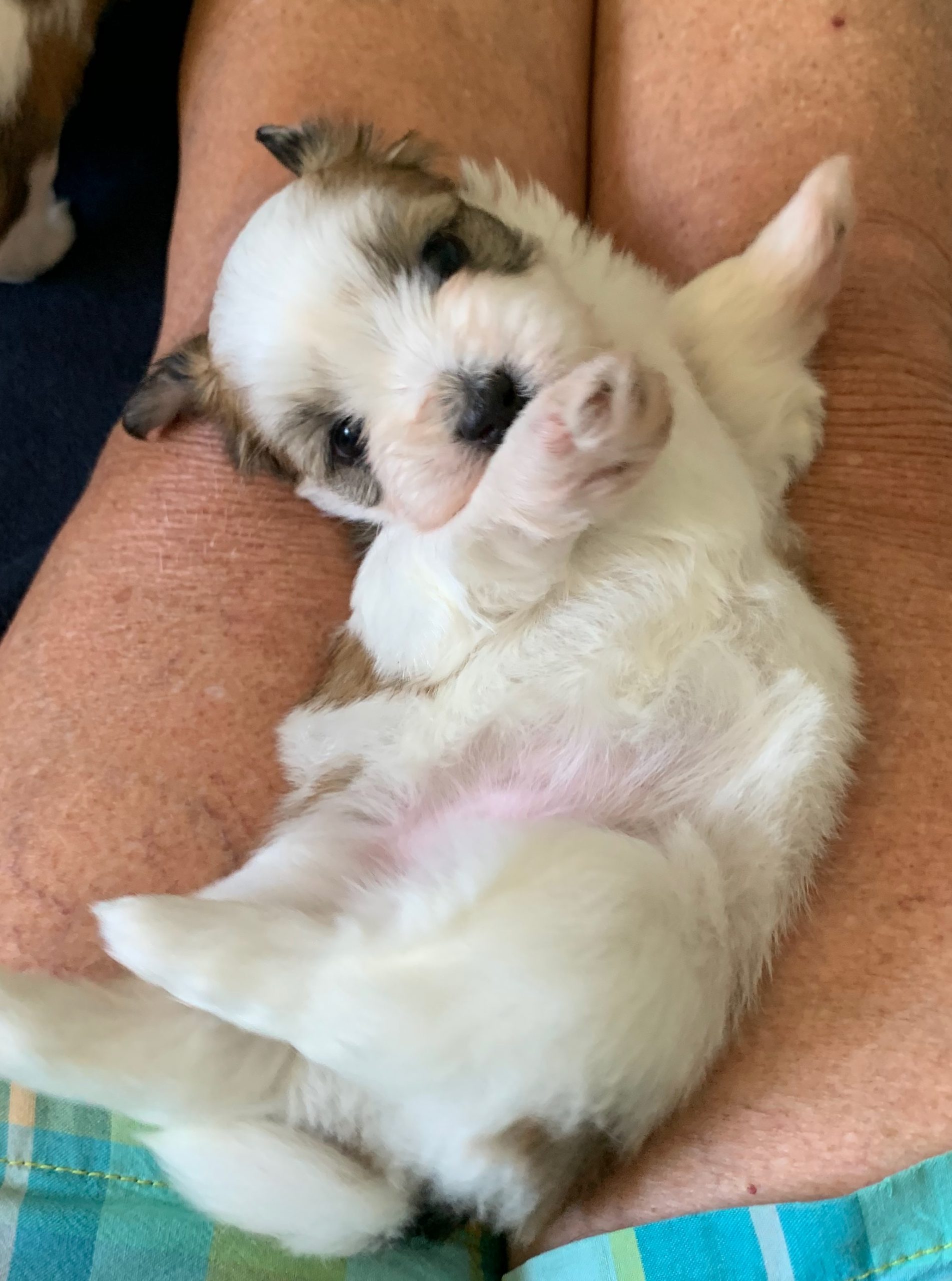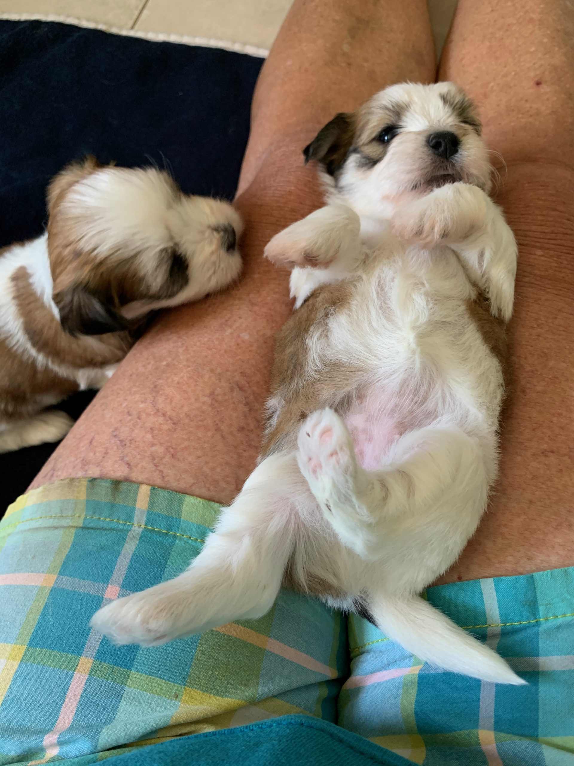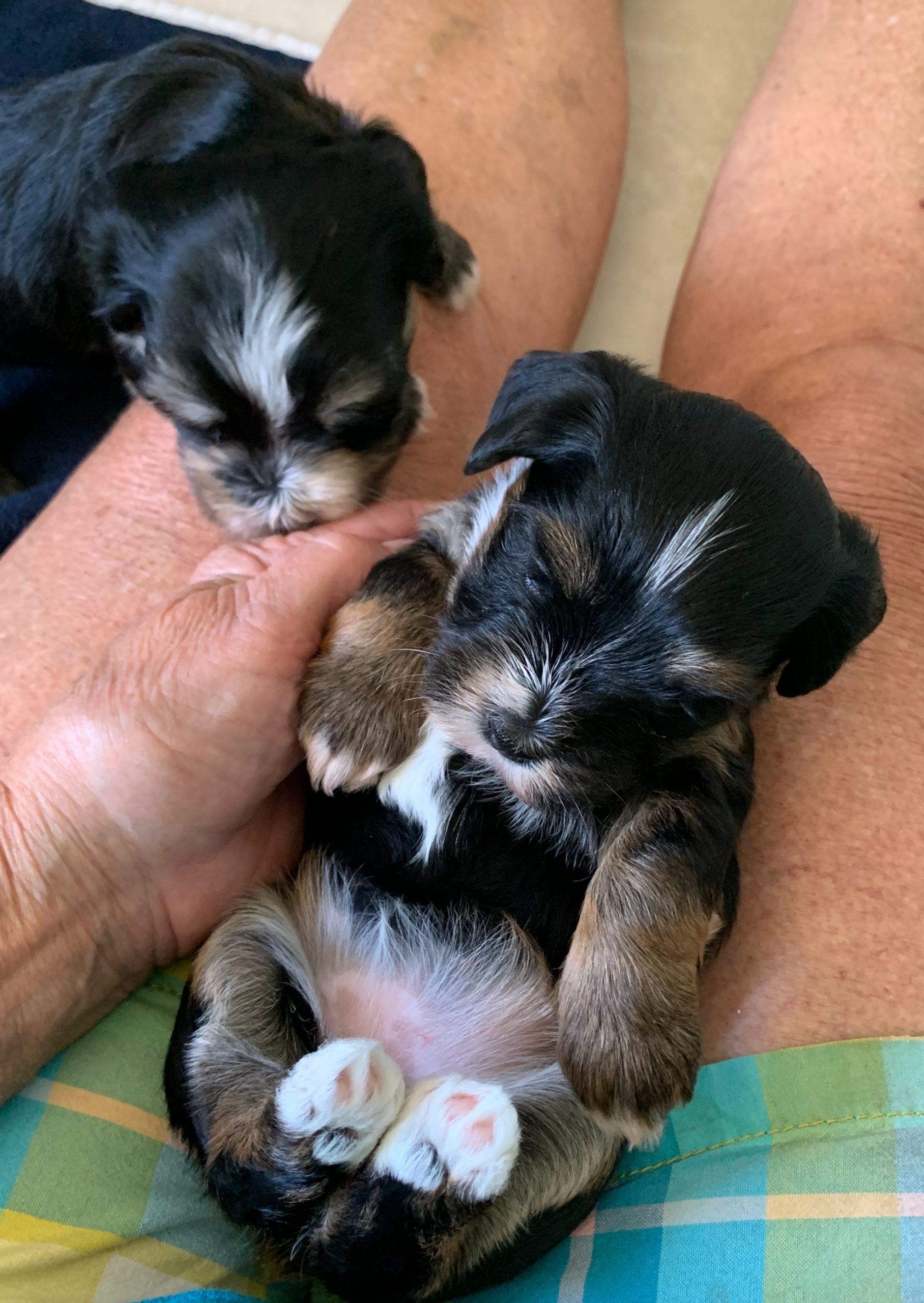 Today we played a bit then we tried each pup out on its back on my lap. It is a way to determine which pups are more confident…at least at this stage of their little lives. With encouragement from the breeder, the pup can learn to relax on it back. That is my goal!
